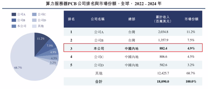 全球算力服务器PCB市场前五公司市占率合计31.3%,其中中国企业占据绝对主导地位,按2022年至2024年全球算力服务器PCB累计收入计,本公司以882.4百万美元的累计收入排名全球第三,本公司占全球市场份额约为4.9%。